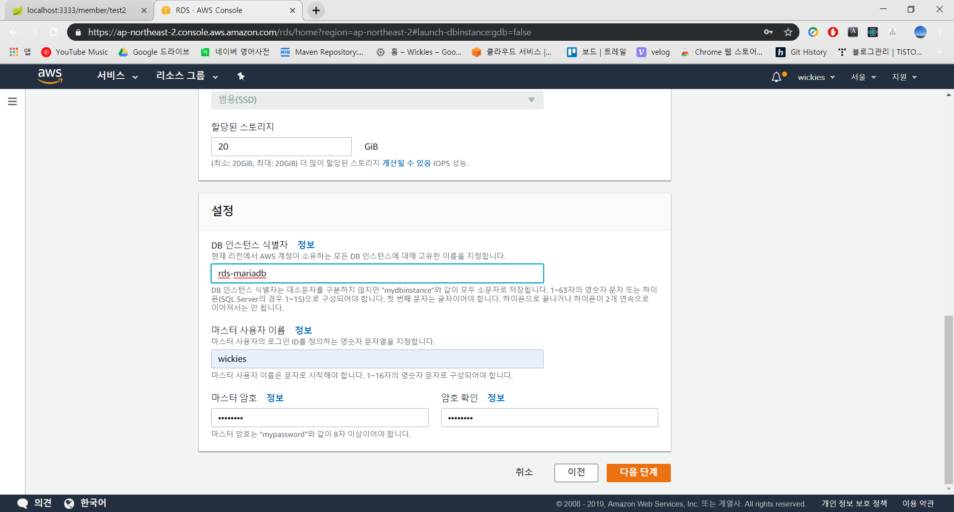 - 기본 설정을 그대로 유지하고 DB 인스턴스 식별자(이름)과 사용자 이름 및 암호를 설정합니다.